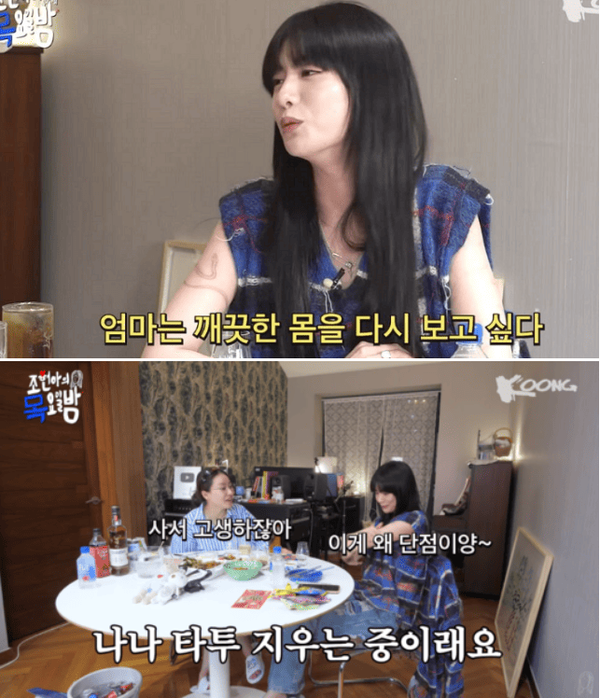 함께 출연한 개그맨 이용진 역시 "아이를 낳고 타투를 지우기 시작했다. 아이가 '이게 뭐야?'라고 물을 때 더 이상 말이 안 통하더라"며 공감했다.