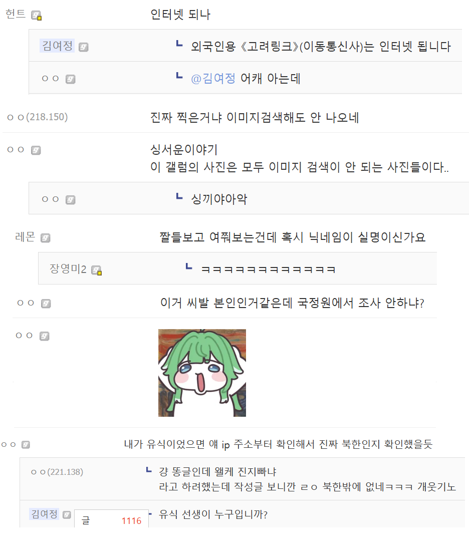 최근 디씨 싱글벙글 갤러리에 나타난 닉네임 '김여정'